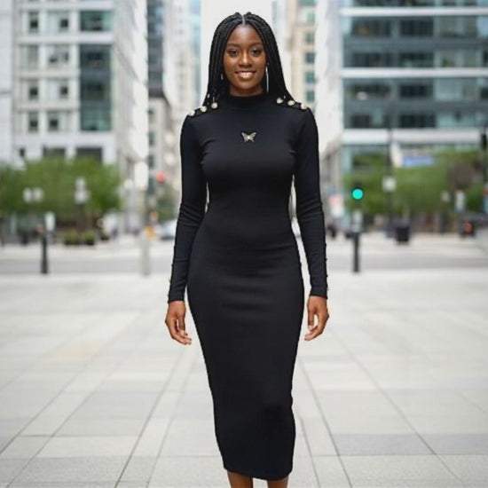 Zanardi Fashion Black Midi Dress with Gold Buttons, Butterfly Emblem & Full-Length Back Zipper