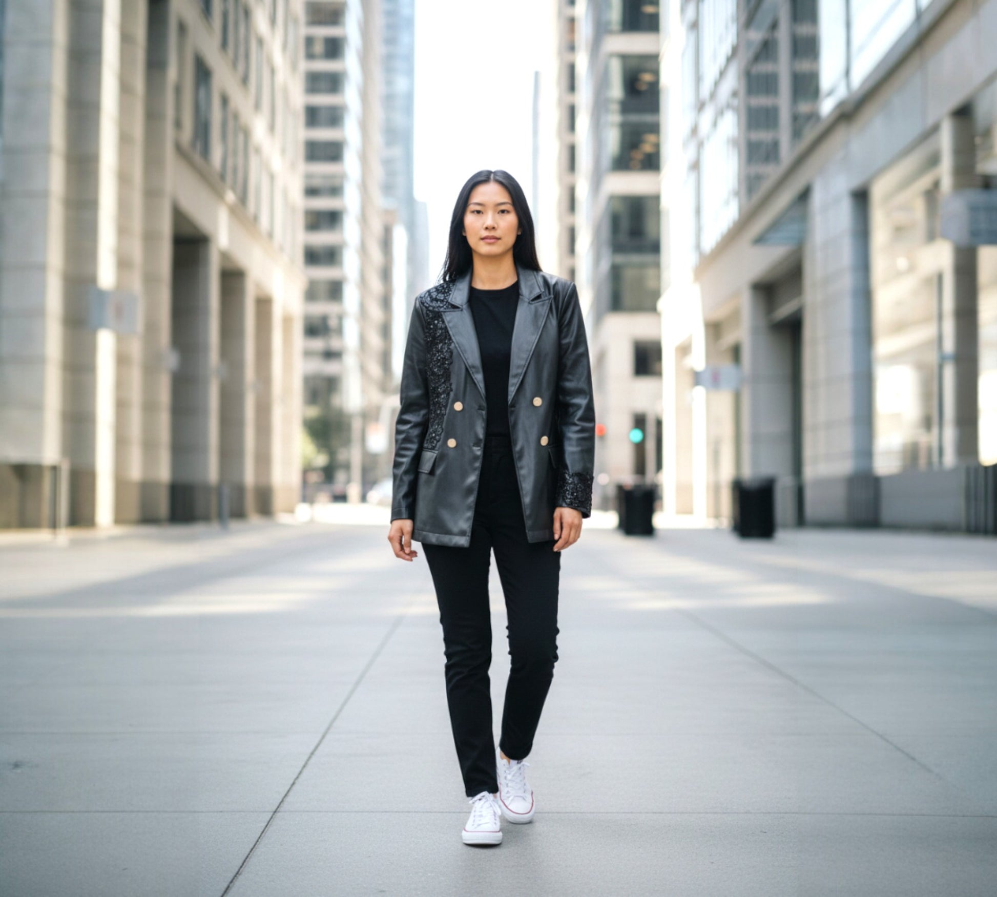 This versatile jacket works effortlessly with casual denim and sneakers for a polished street-style look or layered over a top and heels for an elevated evening ensemble. A perfect blend of edgy and elegant.