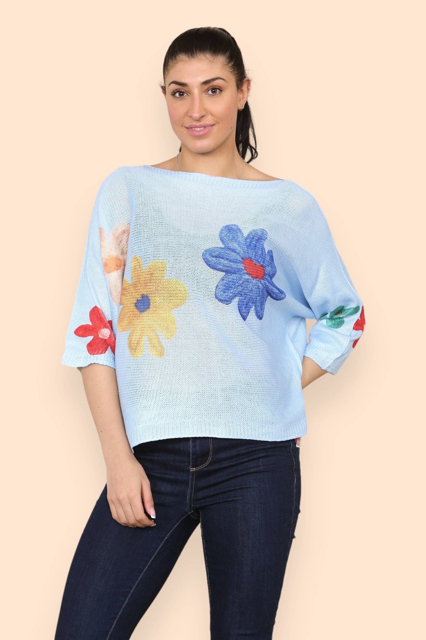 The Kurt Muller Daisy/Rose Knit Top featuring 3/4 sleeves, they strike the perfect balance between coverage and breathability, making them ideal for warmer weather. The summer prints add a playful and vibrant touch, perfect for embracing the season's spirit.